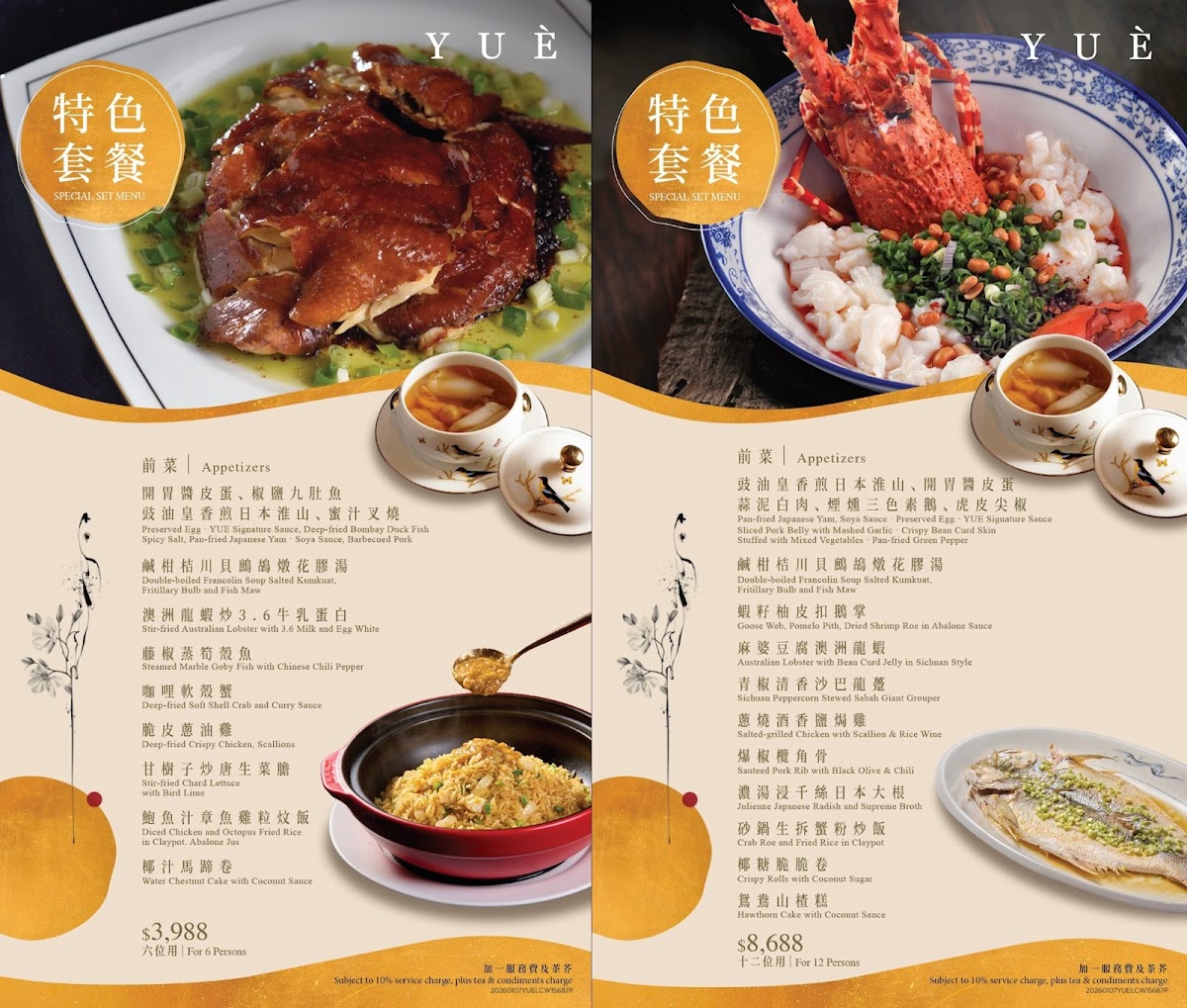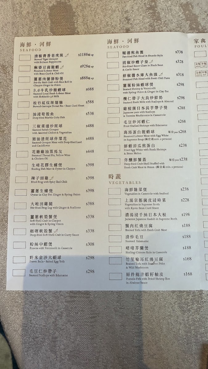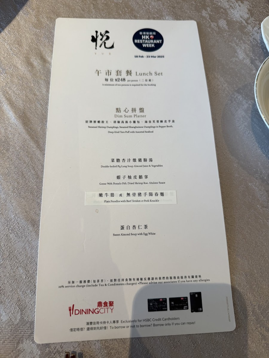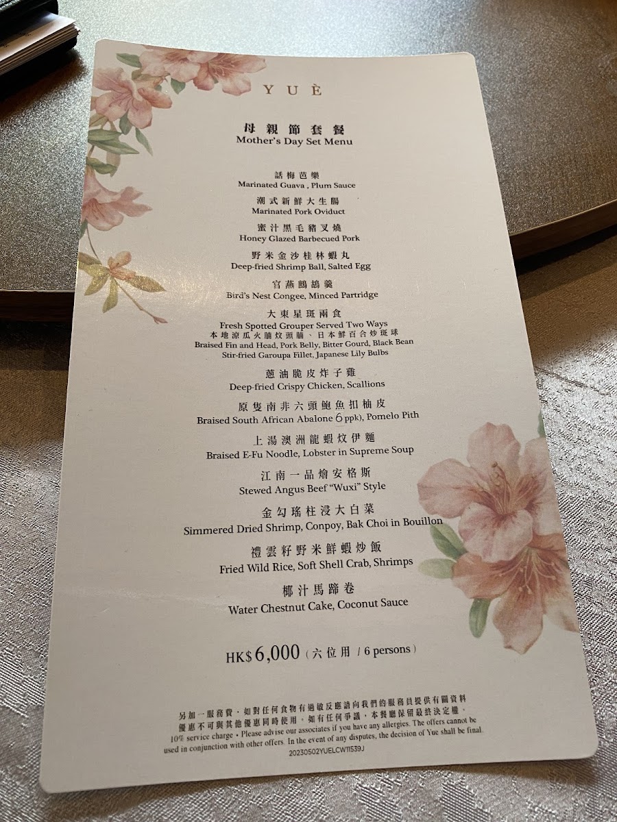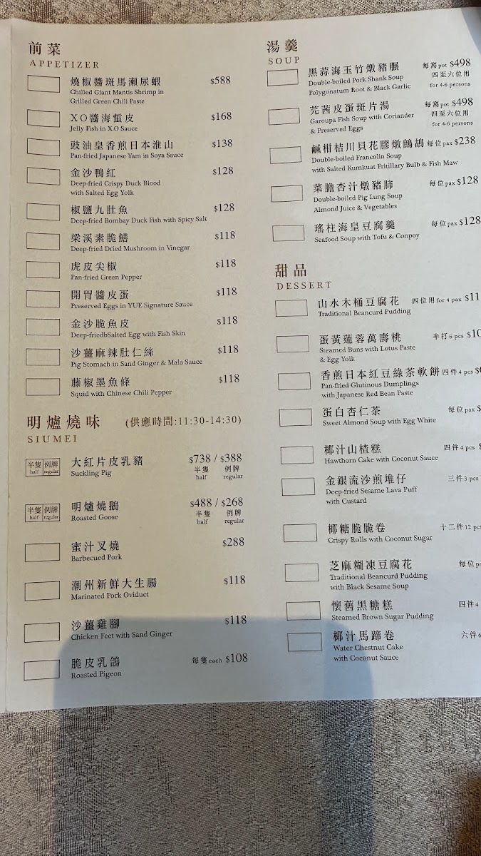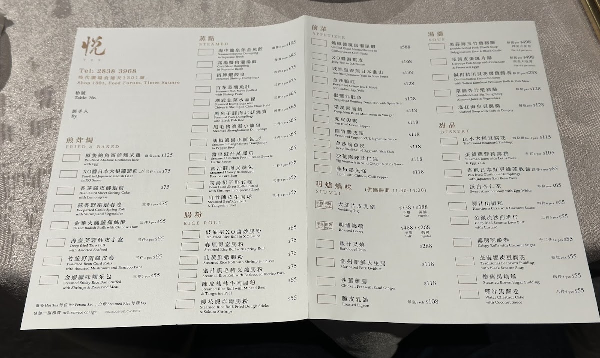 The menu at Yuè Hong Kong feels carefully curated to balance classic Cantonese comfort with refined, celebratory dishes, creating a dining experience that is both familiar and elevated. Dim sum remains a strong foundation, with Steamed Shrimp Dumpling and Their Signature Dumpling delivering clean flavors and delicate textures, while Steamed Rice Roll with Shrimp & Chives, Steamed Beef Meatball, 鮮竹卷, 黑魚子豚肉北菇燒賣, and 甘粟韭菜蝦春卷 showcase thoughtful ingredient pairings and traditional techniques. The kitchen also leans into richer and more indulgent offerings, such as Roasted Pork Belly, Deep Fried Crispy Chicken, Roasted Pigeon, and 脆皮葱油雞 半隻, all of which emphasize crisp skin, depth of seasoning, and confident execution. Seafood dishes like 龍蝦球, 百花魚肚, and Garoupa Fish Soup with Coriander add a sense of occasion to the menu, while slow-cooked soups such as Double Boiled Pork Shank Soup Polygonatum & Black Garlic highlight the restaurant’s respect for Cantonese nourishing traditions. Lighter, aromatic choices including 椰香馬蹄卷 help balance the menu, ensuring it never feels heavy. Desserts provide a gentle, satisfying close, with Sweet Almond Soup with Egg White, Steamed Buns with Lotus Paste, and Mochi Stuffed with Seasonal Fruit offering a contrast of warmth, sweetness, and texture, while touches like Brown Sugar notes enhance the overall harmony. Taken as a whole, the menu reflects a clear identity-rooted in heritage, precise in execution, and designed to leave diners with a complete and memorable impression of refined Cantonese dining.